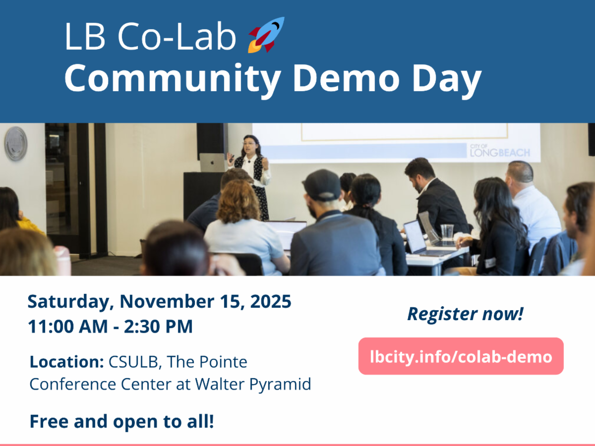 El Long Beach Collaboratory (LB Co-Lab) le invita al Demo Day este mes de noviembre para explorar tres soluciones tecnológicas finalistas que abordan retos locales: un acceso más fácil a los servicios municipales, distritos comerciales más seguros y una gestión más inteligente del espacio público. Estas innovaciones se han desarrollado con la colaboración del personal municipal y los residentes de Long Beach, lo que garantiza que realmente respondan a las necesidades de la comunidad.