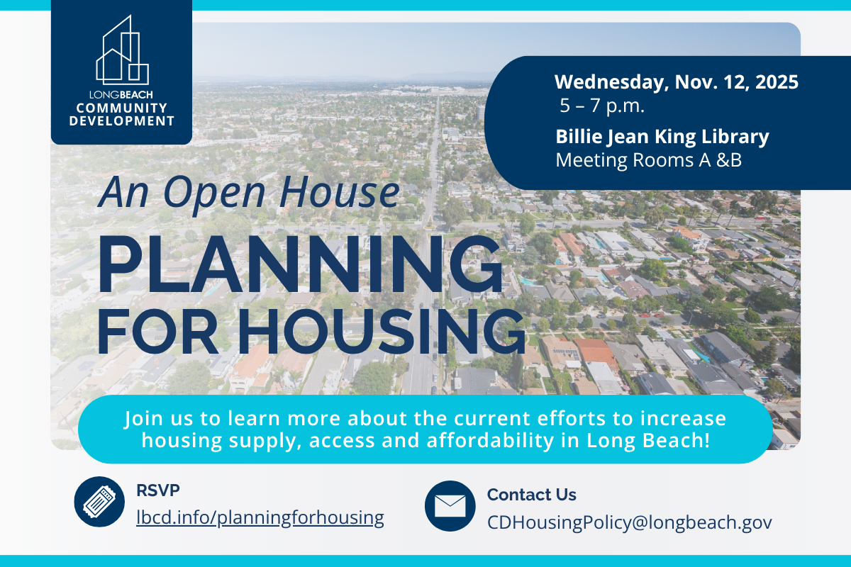 El Departamento de Desarrollo Comunitario de la Ciudad de Long Beach está organizando una jornada de puertas abiertas para promover iniciativas de vivienda importantes e invitar al público a participar en la creación de políticas locales. Durante el evento se presentarán los esfuerzos actuales para aumentar la oferta, el acceso y la asequibilidad de la vivienda en Long Beach, a través de las oficinas de Planificación, Construcción y Seguridad, y Servicios de Vivienda y Vecindarios del Departamento.
