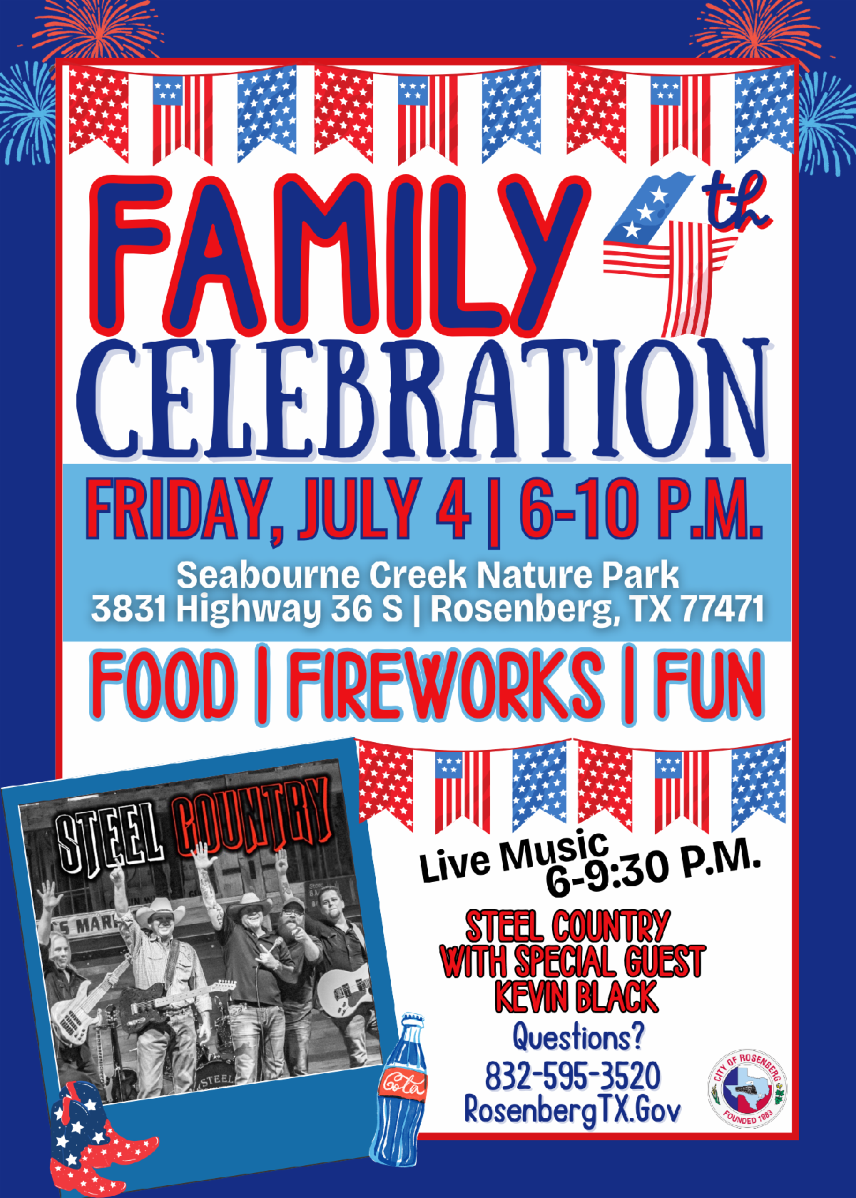 REMDINER: The City invites you to the Family 4th Celebration at Seabourne Creek Nature Park, Friday, July 4, from 6-10 p.m. This free, family-friendly event features food trucks, live music, lawn games and a patriotic atmosphere perfect for all ages. The event wraps up with a spectacular grand finale—a professionally produced fireworks show to light up the Rosenberg sky in celebration of Independence Day. It’s a fun, safe and festive way for the whole community to come together and enjoy the holiday. Read more about the event here.