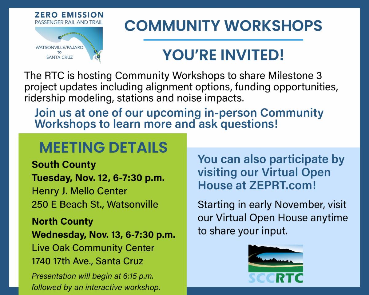 The project proposes a new high-capacity passenger rail service on 22 miles of the Santa Cruz Branch Rail Line. The project also includes 12 miles of Coastal Rail Trail Segments. The events will cover project funding, ridership approaches, stations, bridge structures, noise impacts, and more. Participate in the in-person events on November 12 and 13, or visit the Virtual Open House at any time.