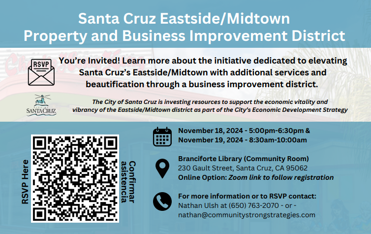 Through workshops and meetings with stakeholders, including property and business owners, the consultants provided a vision for services to potentially be offered in Midtown/Eastside. If you are a property or business owner in the area, we invite you to meet with other stakeholders and the consultant team to learn more about the PBID. Community workshops will be held at the Branciforte Library Community Room at 230 Gault Street, Santa Cruz.
