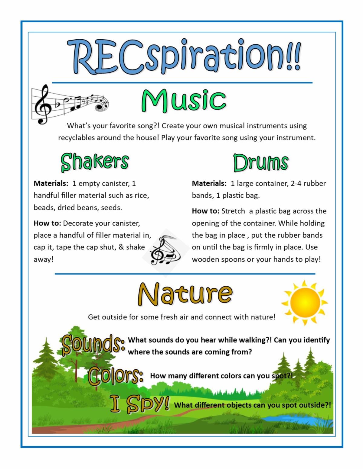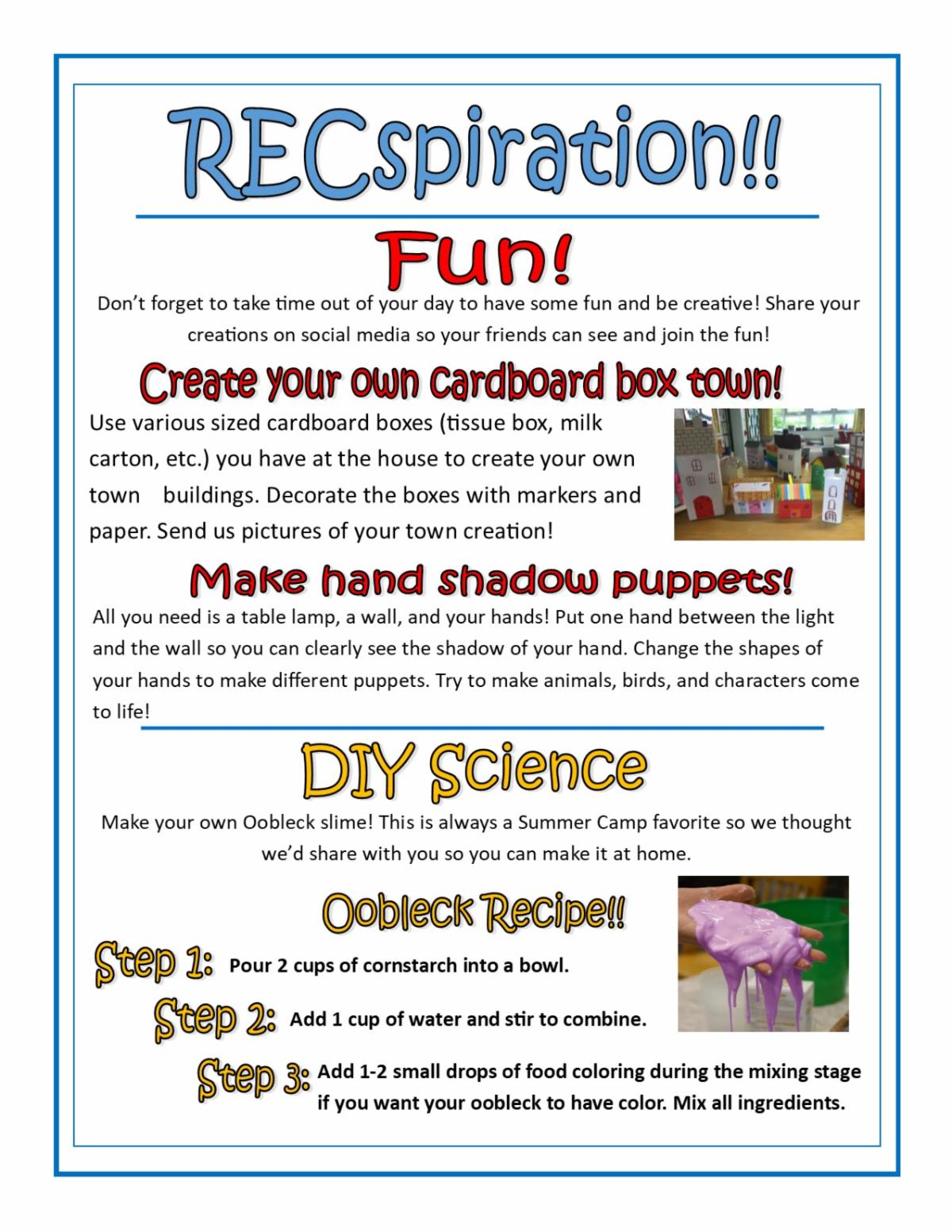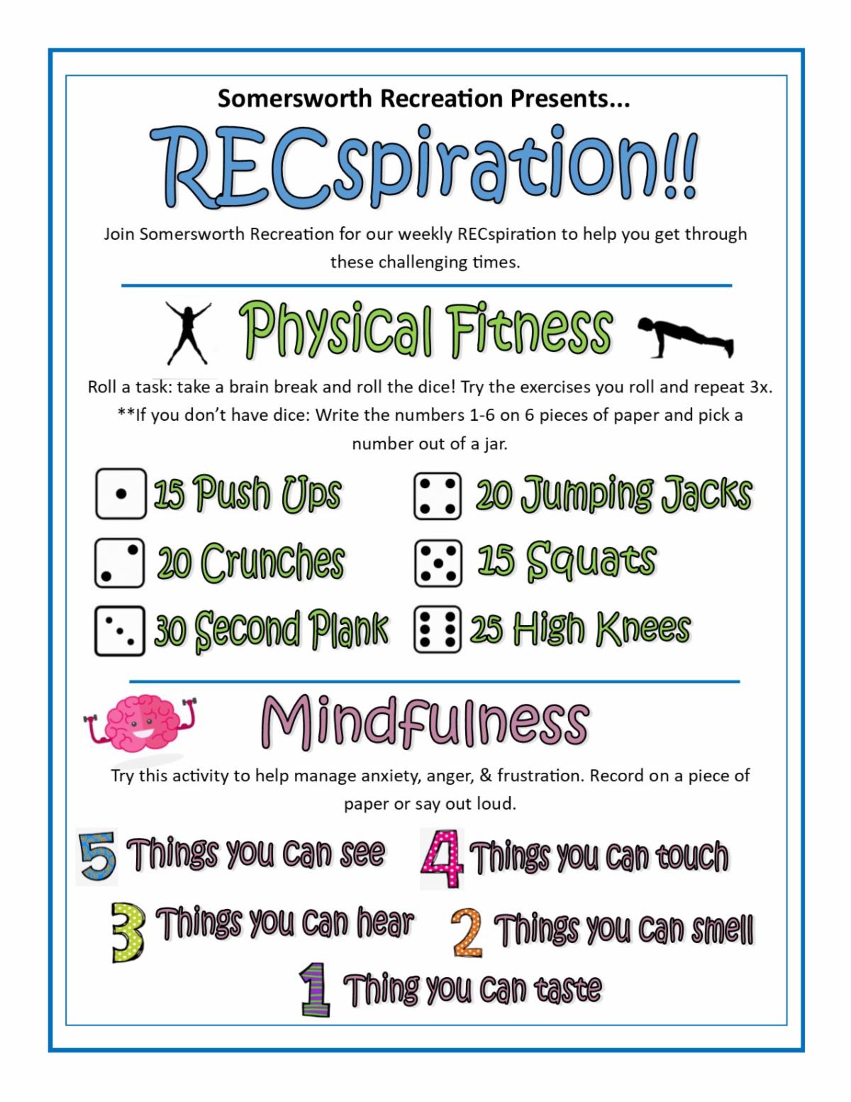 Over the next few weeks, Recreation staff will be putting together a weekly RECspiration newsletter in an effort to provide our community with fun activities for you to try at home while practicing social distancing. RECspiration will be available on the Recreation website as well as our Facebook Page. We encourage folks to follow us on our Somersworth Recreation Facebook Page as we’ll have additional resources and ideas posted weekly. We are here to help our community get through this challenging time.