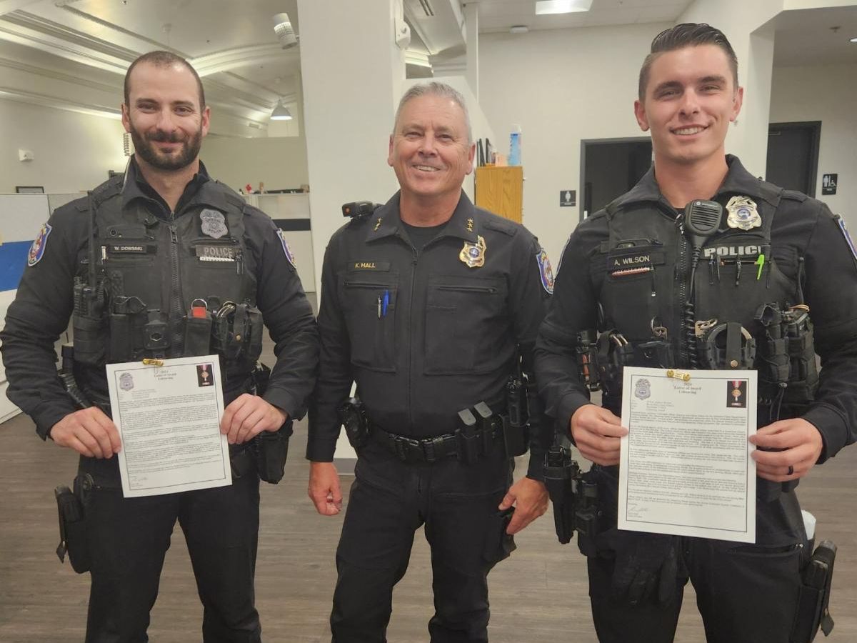 Spokane Police Chief Kevin Hall presented Officers William Dowsing and Andrew Wilson with a Life Saving Medal for their outstanding efforts on the night of July 28, 2024. At just after 2 a.m., officers responded to a report of a missing woman near Main Ave. and Monroe St., where her cell phone signal was detected. While searching the area, they heard her yelling near the river and found her on a steep embankment, about 30 feet from the Spokane River. Despite the dangerous terrain, the officers provided medical aid and treated her for possible hypothermia due to the dropping overnight temperatures.