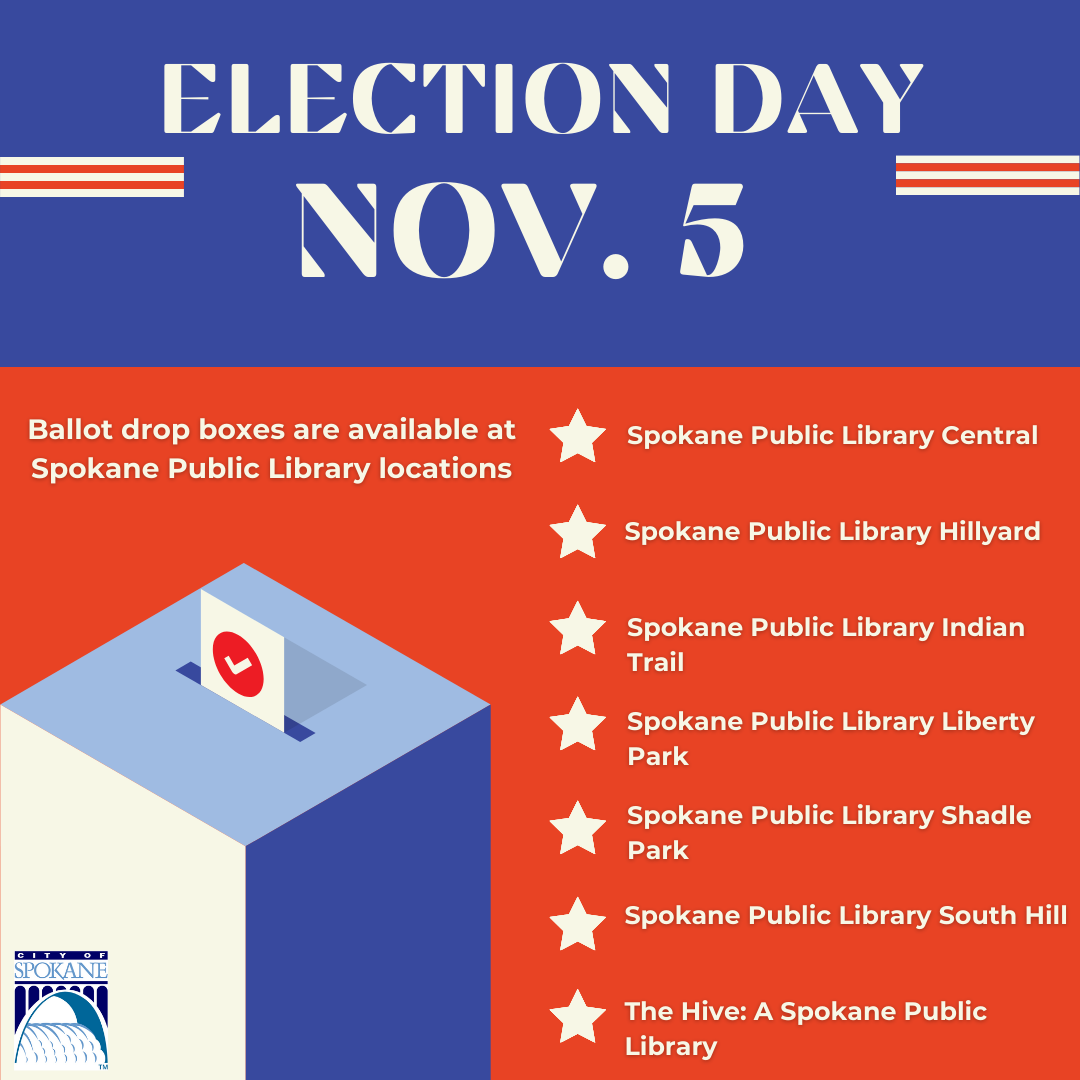 Happy Election Day! Ballot drop boxes close promptly at 8 p.m.; for a full list of ballot drop box locations visit the Spokane County Elections website.