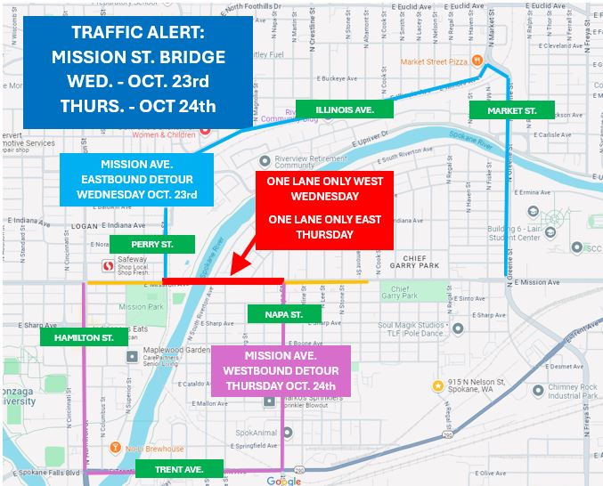 - Thursday, Oct. 24 westbound Mission Ave. will be closed between Napa St. and Perry St., while eastbound Mission Ave. will be reduced to one lane.