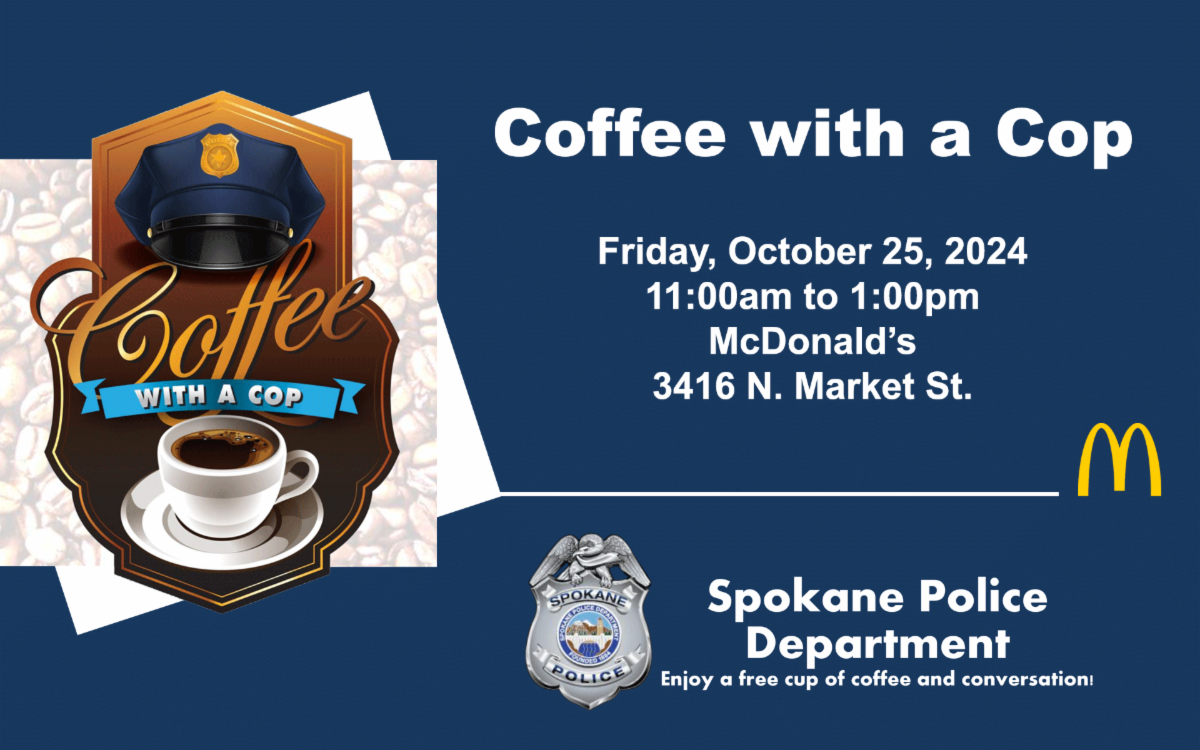 The Spokane Police Department will hold its next Coffee with a Cop event on Friday, Oct. 25, from 11 a.m. – 1 p.m. at the McDonald's at 3416 N. Market Street. All community members are invited to attend! Details on our website.