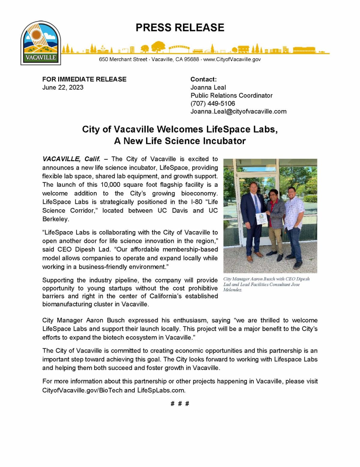 “LifeSpace Labs is collaborating with the City of Vacaville to open another door for life science innovation in the region,” said CEO Dipesh Lad. “Our affordable membership-based model allows companies to operate and expand locally while working in a business-friendly environment.”