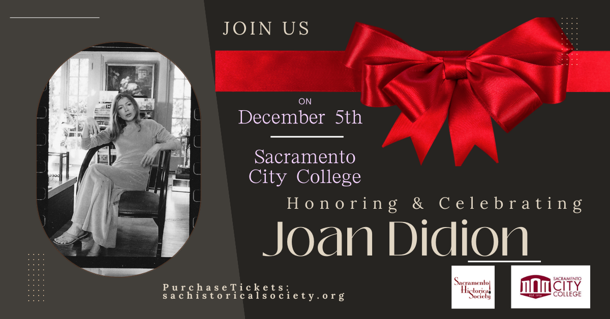 Join us Tuesday, December 5, at 6:30 p.m., in the Art Court and Performing Arts Center, for a celebration of Joan Didion on her birthday! Presented by the Sacramento Historical Society (SHS) in partnership with Sacramento City College, the event will be an acknowledgement of her legacy, the recent $500,000 gift from her family and SHS to support SCC programs, and the renaming of the college’s library to the Joan Didion Learning Resources Center.