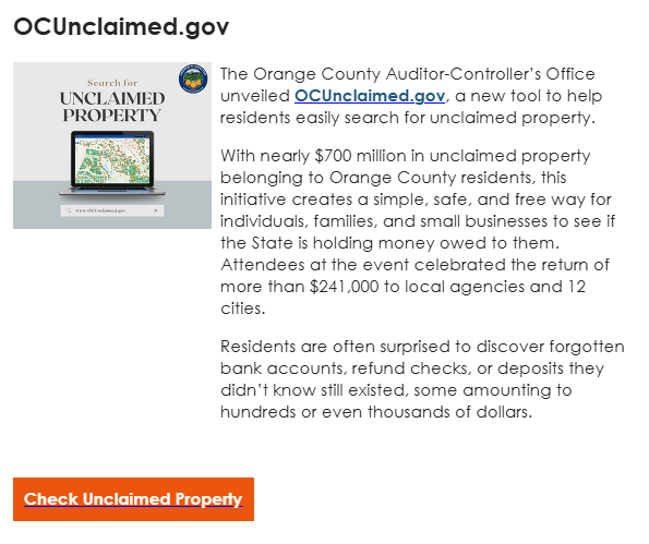 Follow the Auditor-Controller to stay up to date! | | OC Register's 125 Most Influential People in Orange County for 2025 | | OC Unclaimed Property Press Conference | | |