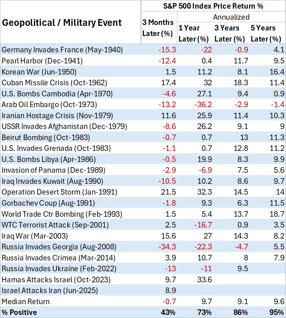 As discussed in the next section, geopolitical shocks have historically been poor reasons to abandon a long-term investment strategy. The S&P 500 has a median return of 9.7% in the year following major geopolitical disruptions, according to research by the Hartford Funds (see table below).