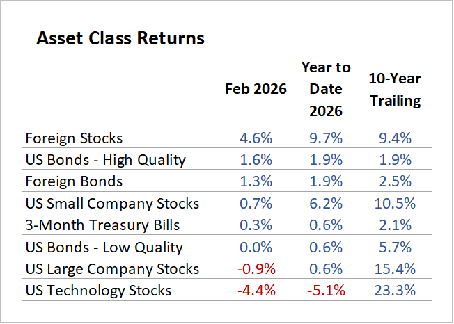By week's end, market participants were no longer treating this as a brief geopolitical tremor but were instead pricing in the possibility of sustained economic disruption. US large company stocks declined by 2% in the first week of March; foreign stocks slid by nearly 7%; and US investment grade bonds were down by about 1%.
