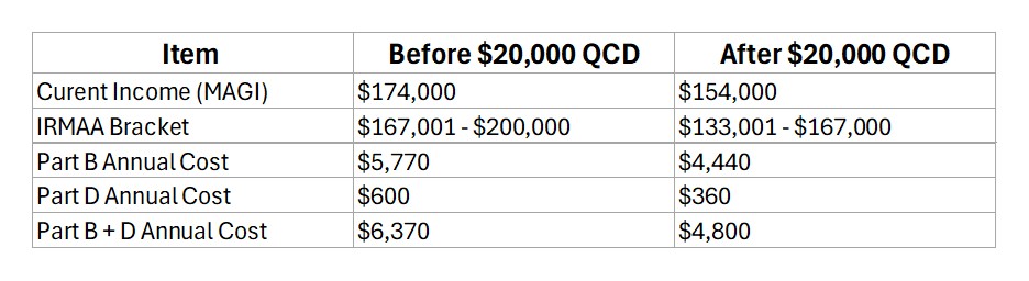 Benefit: Satisfies RMD, excludes $20,000 from taxable income, reduces AGI and possibly lowers Medicare premiums.