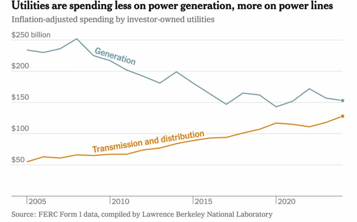 What is leading to this spike in electricity cost? This important question has been addressed in a recent study by the Lawrence Berkeley National Laboratory and the results have been summarized by the New York Times. Their finding is that transmission and distribution costs (power lines) have significantly contributed to the rise in electricity costs, while generation costs (power plants) have actually declined. The decline in electricity generation is likely due to lower cost renewable sources such as solar PV and wind, particularly their low operating costs. The figure above shows a comparison of spending on generation and transmission and distribution.