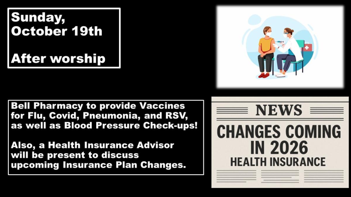 On Sunday, Oct. 19th, Bell Pharmacy will be in the Overflow Room after service to offer flu, Covid, Pneumonia, and RSV Vaccines, as well as Blood Pressure Check-ups. Fill out your pre-registration paperwork here.