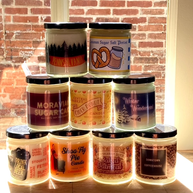 Fragrances Include: Cinnamon Sugar Soft Pretzel, Baked Oatmeal, Cider Donut, Winter Wonderland, Downtown Coffee House, Shoo-Fly Pie, Moravian Sugar Cookie, and even Pennsylvania Adventure, and Drink Local Beer!