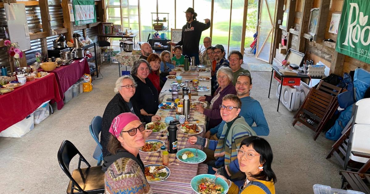 The future residents and current farmers of Rooted NW share a meal in their temporary common house on the land. | |