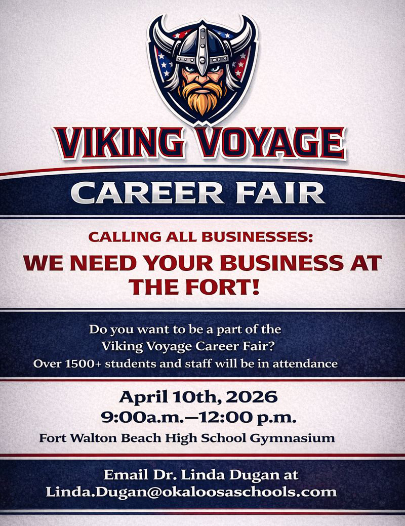 Fort Walton Beach High School will host its Third Annual Viking Voyage Career Fair on Friday, April 10, 2026, from 9:00 a.m. to 12:00 p.m. in the school gymnasium, bringing together students, businesses, and community partners for a meaningful day of career exploration and connection. Read more...