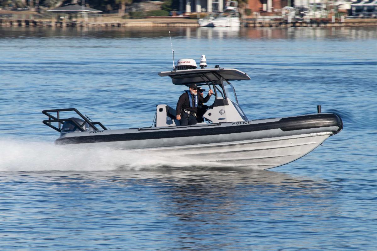 The Police Department boat is a Patrol 23 marine enforcement vessel powered by twin Yamaha 115-horsepower outboard engines. The 23-foot boat features a rigid hull with an inflatable collar designed for superior stability, rapid response, and safe operations in all conditions.