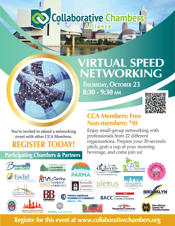 Join professionals from across Northeast Ohio—and beyond—for a fast-paced morning of virtual speed networking, hosted by the Collaborative Chambers Alliance. You’ll meet face-to-face (via screen) with fellow Chamber members, entrepreneurs, business leaders, and international professionals in rotating breakout sessions designed to spark real conversation.