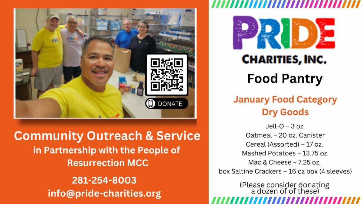 Pride Charities, our partner agency, which operates the food pantry at Resurrection MCC, relies on donations and financial support for the food needed to help the 175 families we assist each month. Please consider picking up oatmeal, cereal, mashed potatoes, mac & cheese, and saltine crackers (items must be in boxes, cans, or canisters) or any of the items found on this list.