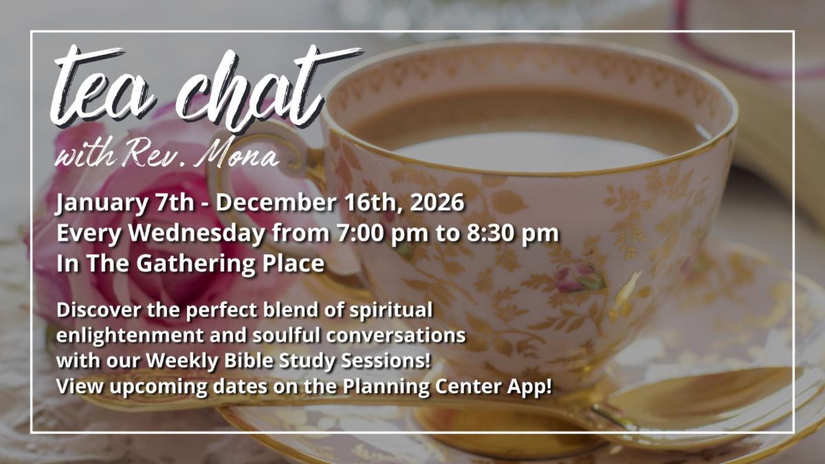 "Discover the perfect blend of spiritual enlightenment and soulful conversations with weekly Tea Chat Bible Study Sessions! Together, we’ll explore God’s Word, reflect on its meaning, and embark on a journey of self-discovery and renewal. Join us as we infuse the essence of spirituality into every sip, guiding you on a journey of self-discovery and reflection. Let's put the 'tea' in spirituality together. Cheers to a harmonious mind, body, and spirit!"