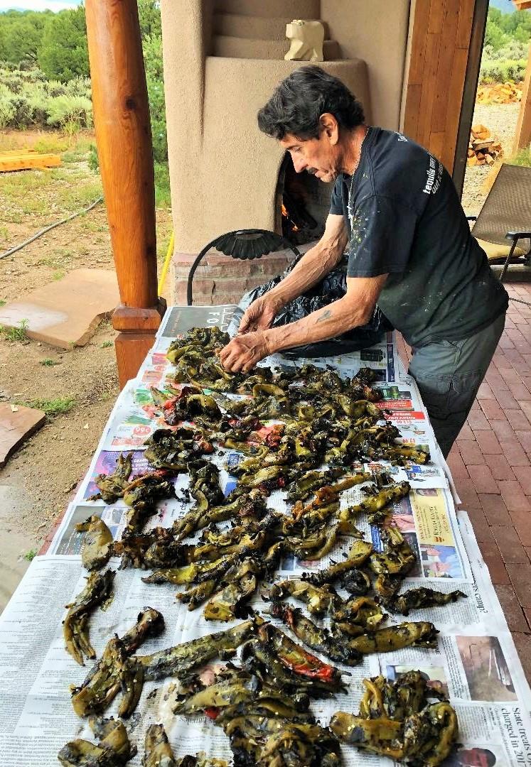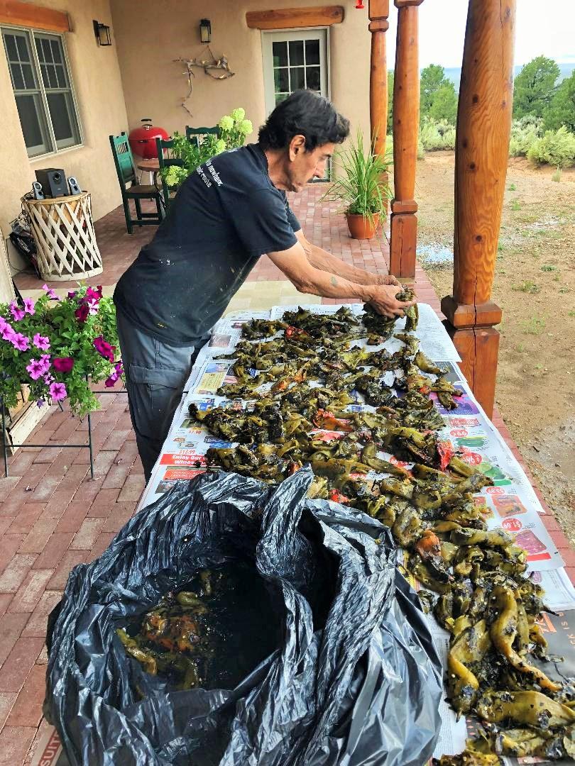 Go up and down the streets of Taos right now, and you will see several roasting stations, especially in front of grocery stores. I eagerly bought my huge, steaming bag of locally-grown deliciousness from Mante’s Chow Cart. Oh how delightful to open that bag and smell those hot, steaming, freshly roasted, meaty chiles! Big fat ones! Every fall, I lay them on a table, cool the darlings down and divide them into freezer bags to last the entire year. Mmmmm…..