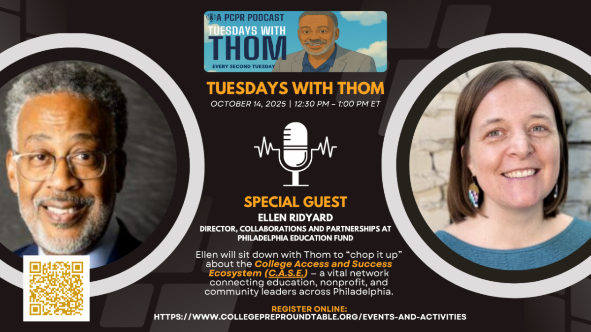Hosted by Philadelphia College Prep Roundtable (PCPR) Executive Director Thomas Butler, "Tuesdays with Thom" is a 30-minute, podcast-style information sessions that offers a relaxed yet insightful space to stay current on initiatives, programs, partnerships, and everything in between that’s shaping the college access and success landscape.