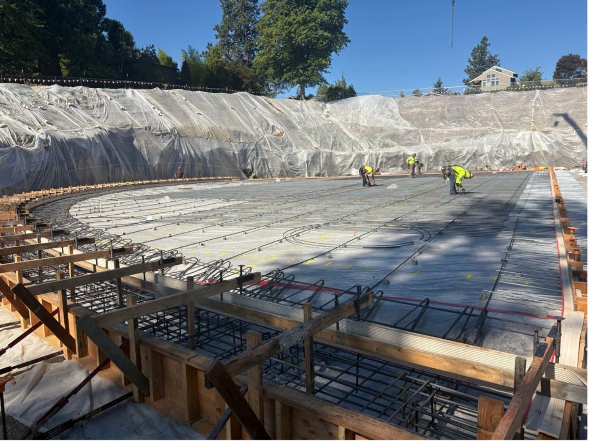 In addition to the crew required to place and finish the concrete, there are two separate concrete inspectors onsite, one employed by the concrete supplier and another contracted by EWEB. The inspectors take samples from every batch of concrete poured. Samples are cured and tested for strength after 7, 21, and 28 days to ensure the quality and strength of the concrete.