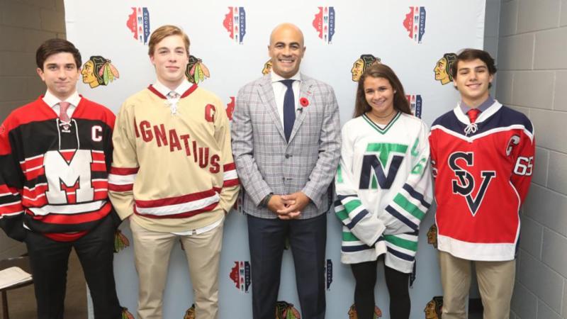 Captain Spotlight is a youth hockey initiative that features four local high school hockey captains per month. These captains are invited to a Blackhawks game and are interviewed on the defining characteristics of what makes a good leader. Congratulations to Zack Meeker (Marist), Jack Connolly (St. Ignatius), Isabelle Sennett (New Trier) and Mark Young (St. Viator)!