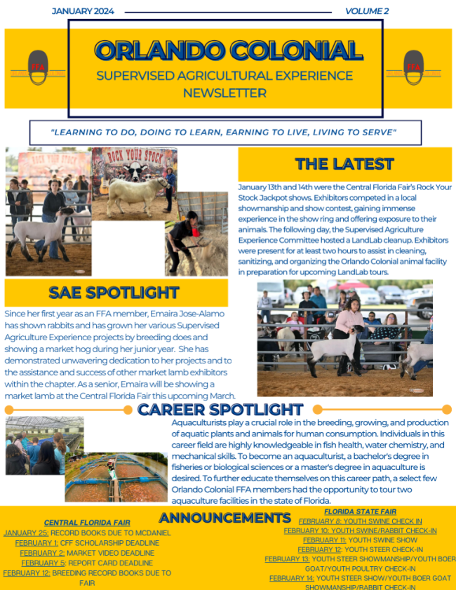Pictured at the top of this issue: On Friday, January 19th, the six student officers of the National FFA Organization visited the 670 members of the Orlando Colonial FFA. All students in the Agriscience and Animal Science classes gained the opportunity to learn from the officers as they led interactive workshops on individual values, team collaboration, and personal growth. With a national membership of 945,988 members representing 9,163 schools from all 50 states, Puerto Rico, and the Virgin Islands, the opportunity to host the National FFA Officers is an incredible honor. (Please see our FFA segment in this week's issue below).
