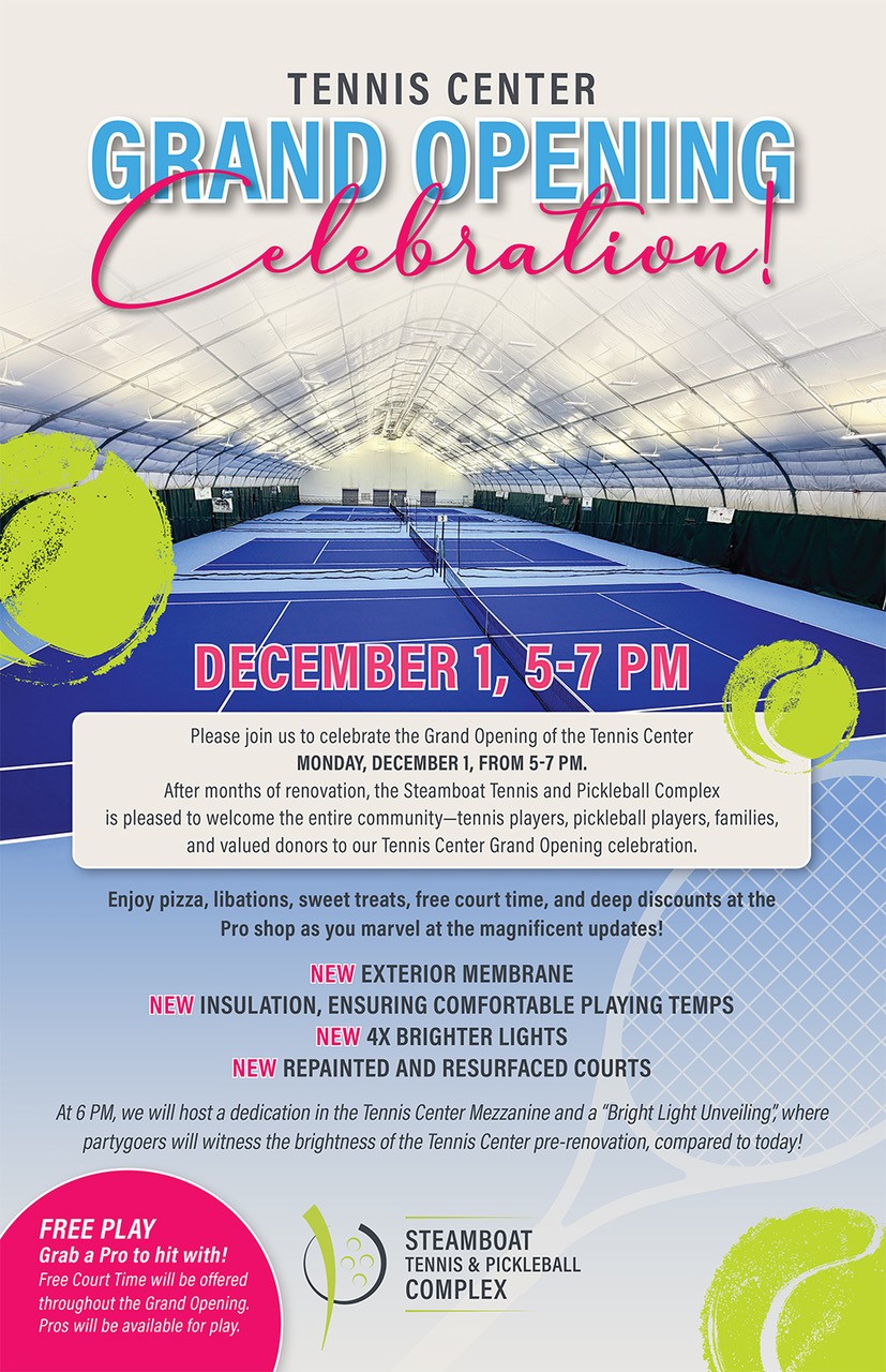 The Steamboat Tennis and Pickleball Complex needs your support now more than ever to help us keep prices affordable for pickleball and tennis, offer subsidized court time to underserved youth, participate in youth outreach programs, coach student athletes and more. Please remember, we are a public, nonprofit organization, currently paying down a $5M loan on the Pickleball Center, and $800K away from our fundraising goal to fully renovate the Tennis Center!