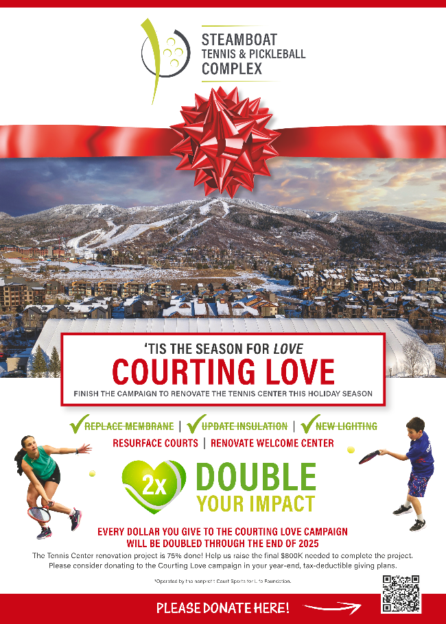In addition to participating in Yampa Valley/Colorado Gives Day, the Steamboat Springs Tennis and Pickleball Complex has a simultaneous campaign running, Courting Love, to finish the Tennis Center renovation, complete with a $100K year-end, double-your-impact "Match." Thanks to anonymous donors, the Courting Love "Match" means that every dollar donated to Courting Love will be instantly doubled through the end of the year!