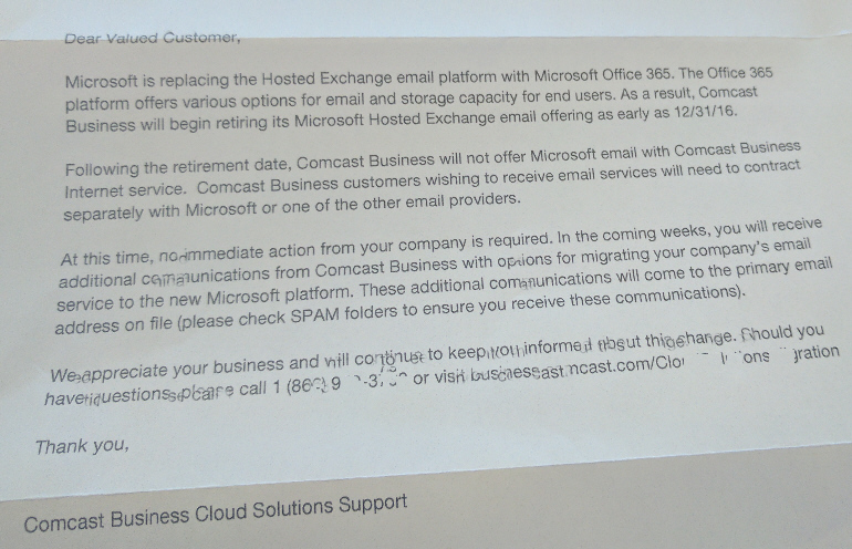 Comcast Business Customers - did you receive the letter below regarding your email? Comcast is migrating to Office 365 from hosted Exchange email. Although much of the process should be seamless to your business, you are required to then access your email from a new location and all of your emails will be migrated to a new Cloud Solution through Comcast.