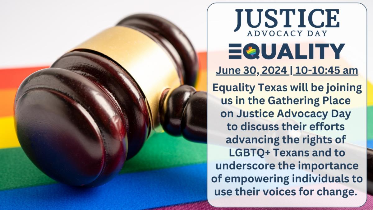 Equality Texas will be joining us in the Gathering Place (10 am - 10:45 am) on Justice Advocacy Day to discuss their efforts advancing the rights of LGBTQ+ Texans and to underscore the importance of empowering individuals to use their voices for change. The Social Justice Advocacy Day is an initiative not only to highlight the mission of local advocacy groups/organizations, but to engage and educate the congregation and community on important social justice issues. This initiative not only amplifies the voices of those fighting for justice but also serves as a powerful reminder of the collective impact we can have in our communities.
