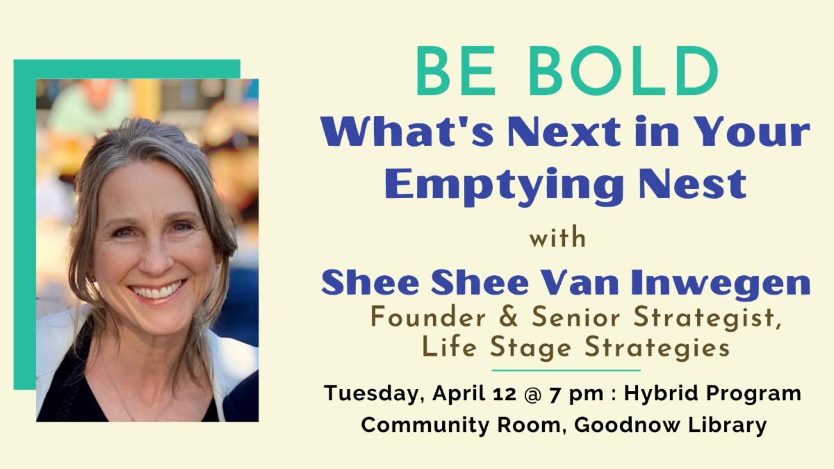 The Goodnow Library Foundation invites you to its second Be Bold event of 2022 on Tuesday, April 12 @ 7pm! Shee Shee Van Inwegen will be sharing about What's Next in Your Emptying Nest.