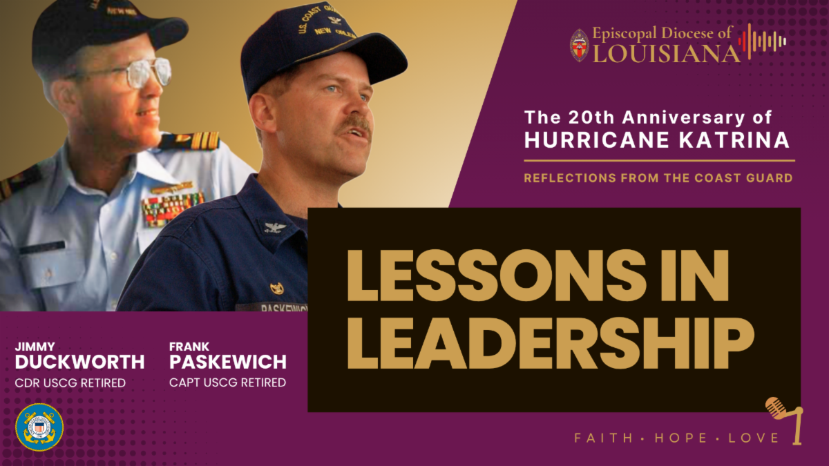 | | Frank Paskewich, Capt., USCG (Ret.), and Jimmy Duckworth, CDR, USCG (Ret.), join Bishop Shannon Rogers Duckworth and Lauren Dunn, Diocesan Youth Coordinator, in a conversation about their experiences as first responders during and after Hurricane Katrina. The discussion focuses on leadership, community service, and lessons we can apply in our own lives. | | EDOLA Remembers Hurricane Katrina at 20 |