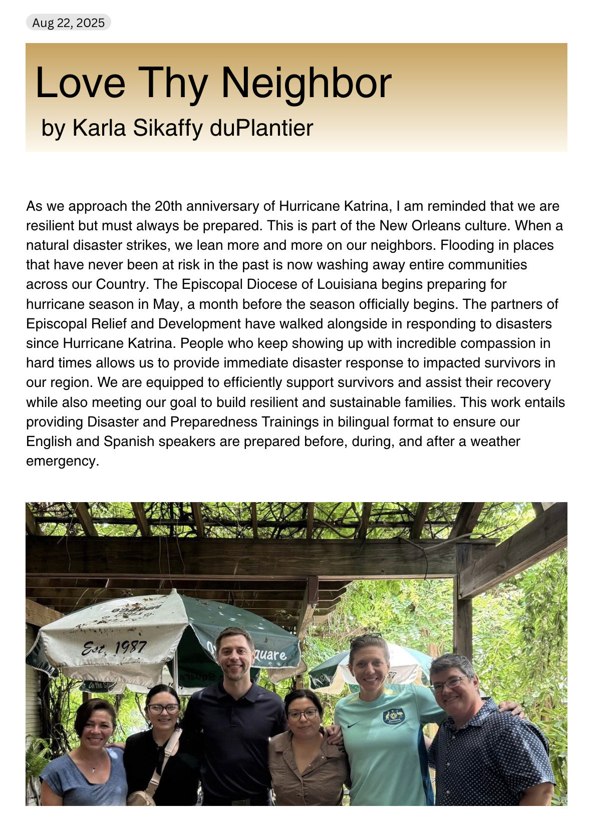 | | Katrina 20th Anniversary Interfaith Prayer Service | | Thursday, August 28 6 PM St. Louis Cathedral Prayer Service | | Bishop Duckworth, Rev. Stephen Craft, and Rev. Austin Wendt will join faith leaders from across the New Orleans metro area for a solemn interfaith prayer service commemorating the anniversary. All are welcome to attend. | | |