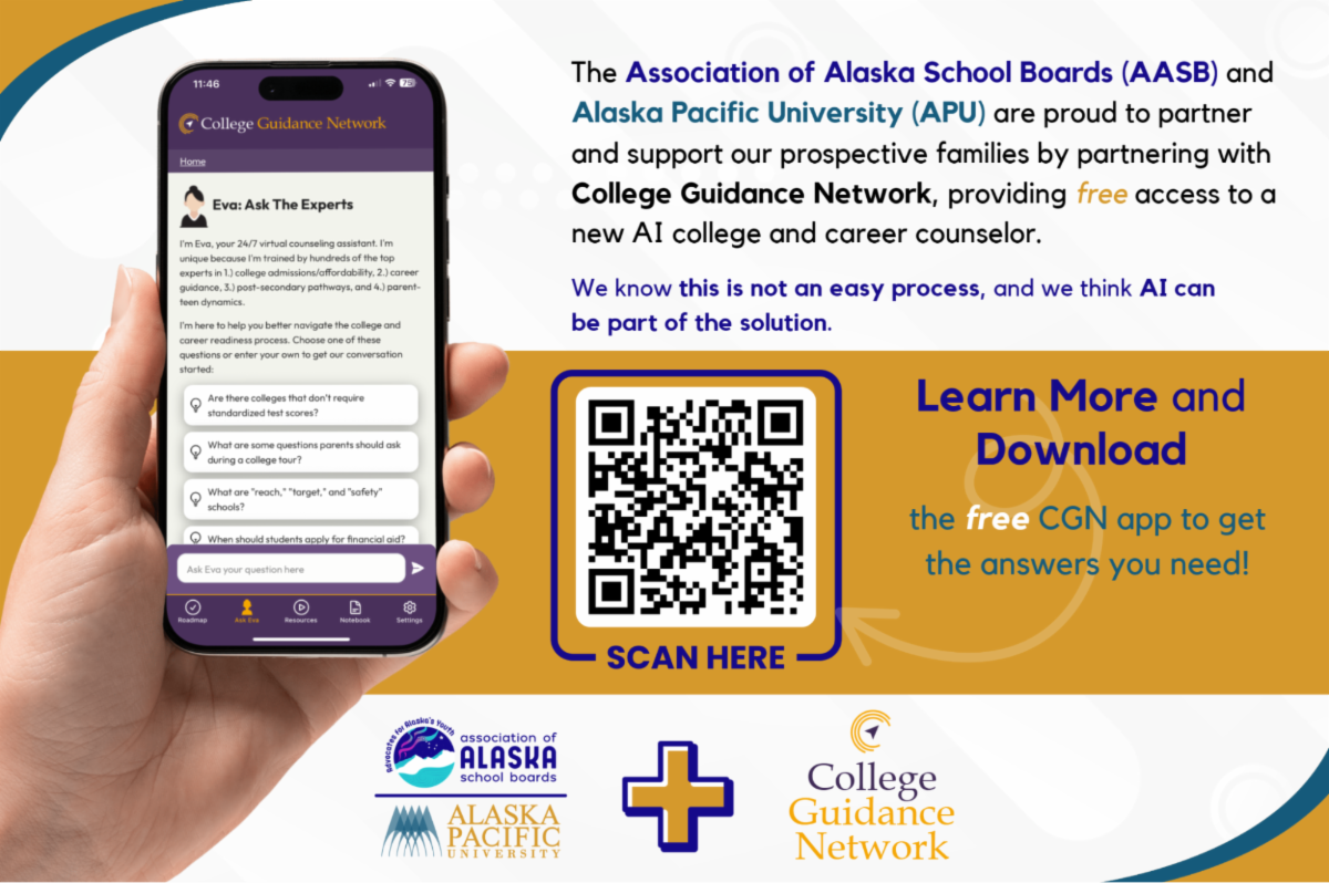 The Association of Alaska School Boards (AASB) and Alaska Pacific University (APU) are proud to partner and support our prospective families by partnering with College Guidance Network to provide free access to a new AI college counselor platform and mobile app.