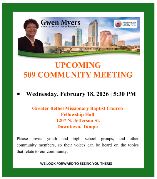 | | On Monday, December 15, 2025, I attended the ribbon cutting ceremony for the Fair Oaks Community Center. The Ribbon Cutting Ceremony was a significant event in Tampa's community development and marks the official opening of the Fair Oaks Community Center, a $34.7 million investment in the city's parks and community infrastructure. The event was attended by city leaders, community members, and local representatives, celebrating the completion of this major project that aims to enhance the quality of life for East Tampa residents. | | Naya Young, Tampa City Councilwoman | | On Wednesday, December 17, 2025, my staff and I hosted a 509 Community meeting at my church, Greater Bethel Missionary Baptist Church. We approved minutes from the previous meeting, heard updates from various committees and remarks from Tampa City Councilwoman Naya Young. We were grateful to have Black Treasures Investment youth in attendance. | | Commissioners Donna Cameron Cepeda, Harry Cohen, and Christine Miller | | |