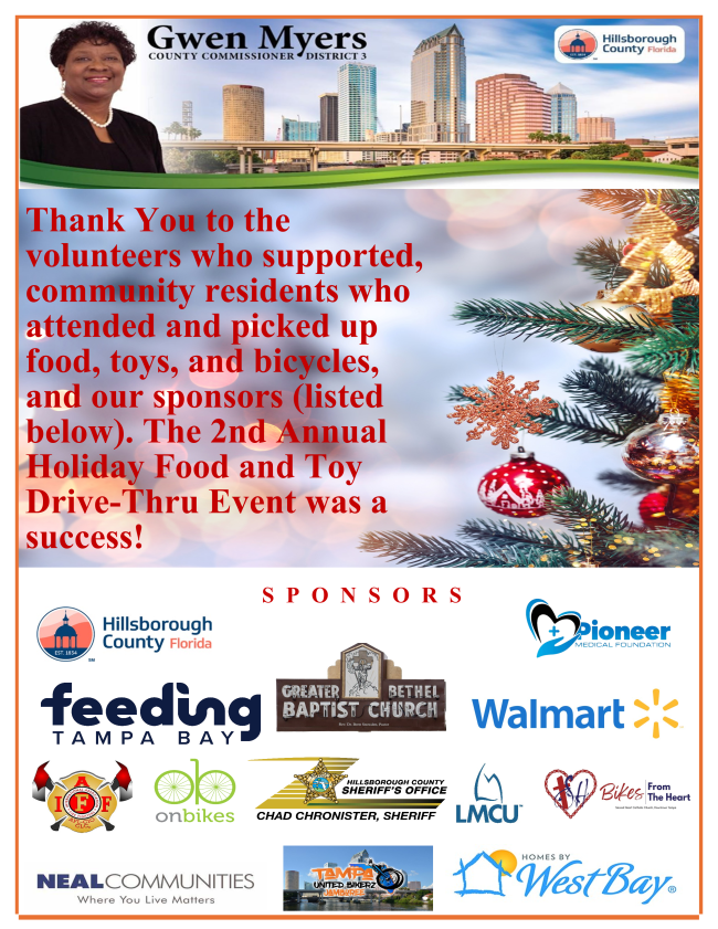 | | 2nd Annual Food and Toy Drive-Thru Giveaway and Bicycle Raffle | Tim Dudley, Director, Office of Emergency Management, Jason Dougherty, Chief, Hillsborough County Fire Rescue (HCFR), Deputy Chief Jose "Pep" Prado, HCFR, and Ross Anderson, Founder, Men of Vision | | On Thursday, December 18, 2025, my Aides, Wanda West and Robbi Smith and I hosted the 2nd annual Gwen Myers Food and Toy Drive-Thru Giveaway at my church, Greater Bethel Missionary Baptist Church. We donated hundreds of meal boxes to local families, hundreds of bags of toys, household items and more than 150 bicycles. | | Was this Newsletter forwarded to you by a friend, colleague, or family member? | | | | |