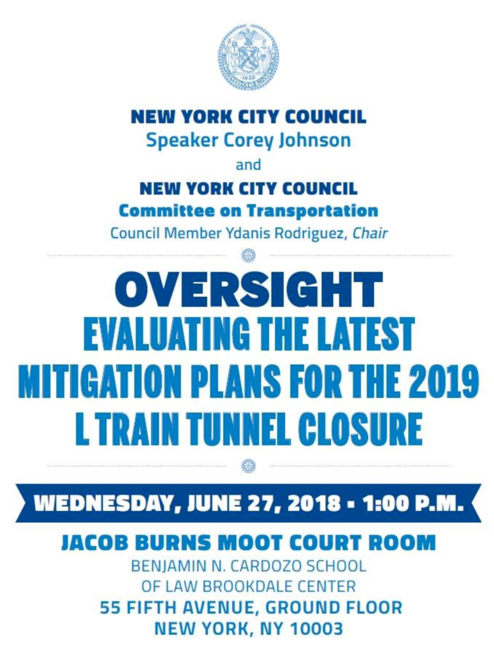 Join us tomorrow, Wednesday, June 27th at 1PM for the Council Committee on Transportation's off-site hearing on the L train shutdown at the Benjamin N. Cardozo School of Law.