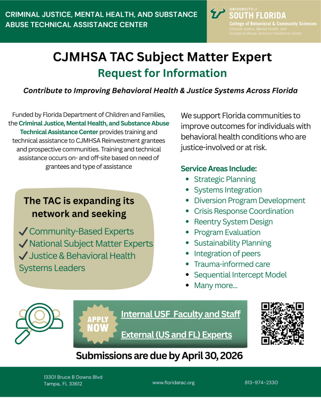 We are seeking experienced USF faculty and staff, community-based leaders, and national experts with demonstrated expertise in criminal justice and behavioral health systems to join our multidisciplinary technical assistance network. Apply here.