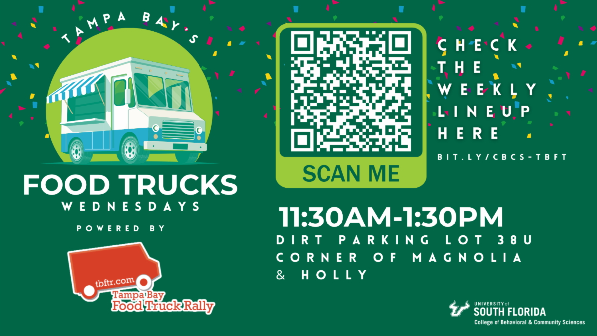 Working with USF Dining, the Tampa Bay Food Trucks are returning to campus every Wednesday from 11:30 a.m. to 1:30 p.m. with a more visible location near the corner of Magnolia and Holly (Parking lot 38U). It’s a short walk from MHC and PCD. See the schedule and menus here.