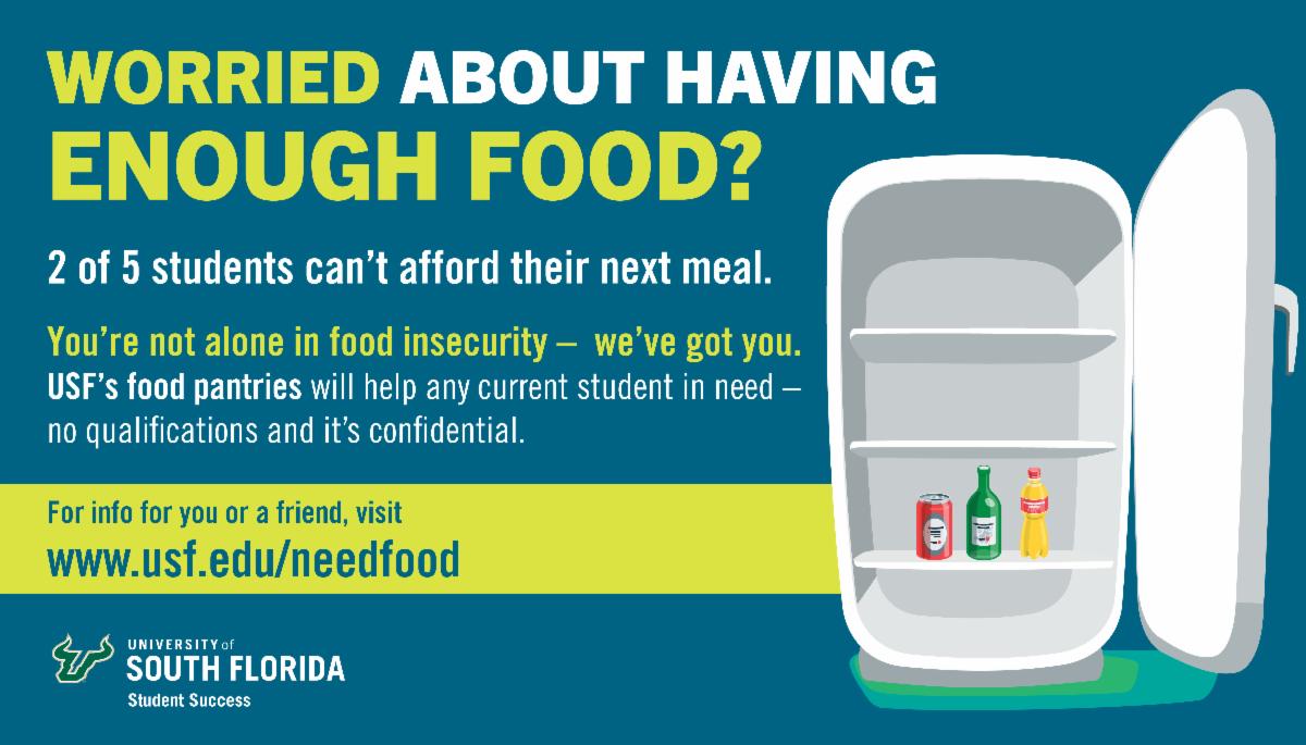 Please consider donating nonperishable food items to the Feed-A-Bull food pantry. The Feed-A-Bull Food Pantry helps to ensure that students do not have to choose between buying textbooks or buying groceries – because no student should ever go hungry! Donations will be picked up Nov. 4.