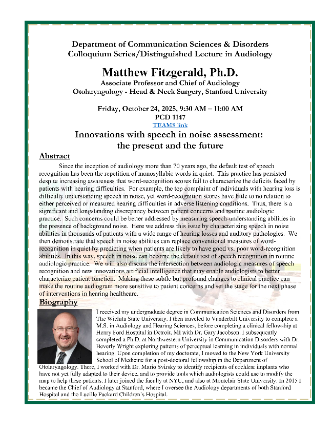 Join the Department of Communication Sciences and Disorders for a colloquium featuring Dr. Matthew Fitzgerald, associate professor and chief of audiology, otolaryngology - head & neck Surgery at Stanford University. Dr. Fitzgerald will be discussing Innovations with speech in noise assessment: the present and the future. RSVP to jungmeelee@usf.edu.