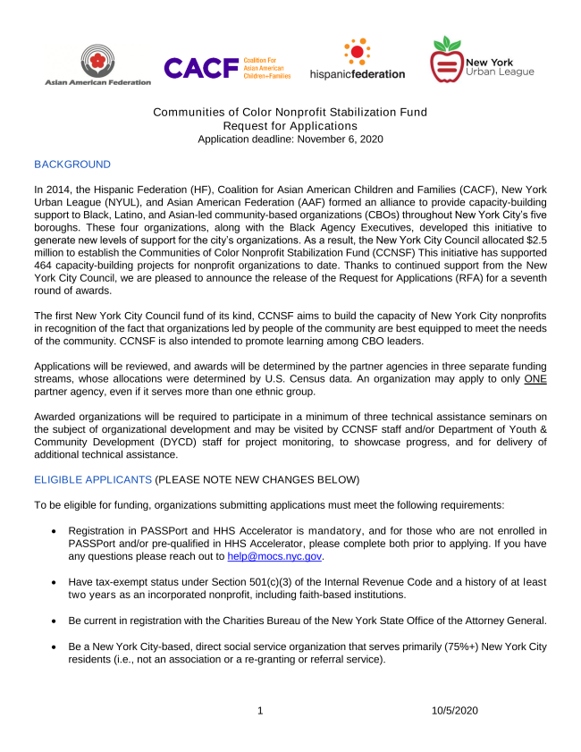 The Communities of Color Nonprofit Stabilization Fund (CCNPSF) Council-funded initiative supports capacity building, strengthening and rescuing of nonprofit human service providers that serve communities of color including, Muslim and Immigrant communities, and community outreach. Its grants may be used for projects related to financial management, board development, technology, facilitated collaborations and merger planning, and outcomes.