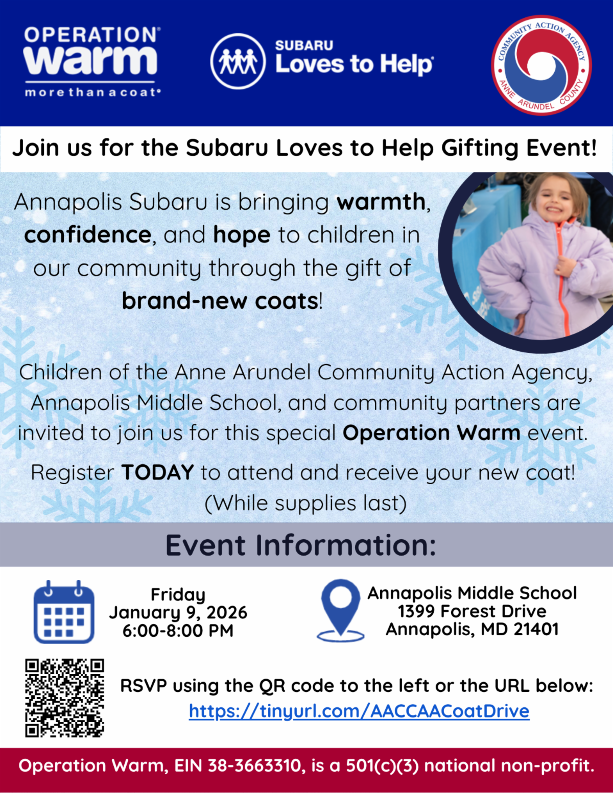 For the third year, Annapolis Subaru has selected the Community Action Agency as their non-profit partner for Operation Warm! This year, the event is taking place on Friday, January 9, 2026, at Annapolis Middle School from 6 – 8 p.m. We will be distributing over 500 coats for children aged 2-18 at the event, and children must be present to select a coat to take home.