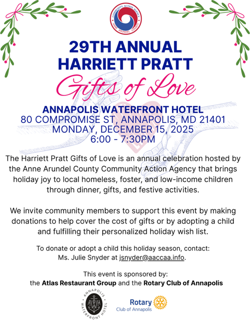 Continuing a cherished tradition, the Anne Arundel County Community Action Agency will host the 29th Annual Harriett Pratt Gifts of Love on December 15, 2025, at the Annapolis Waterfront Hotel.