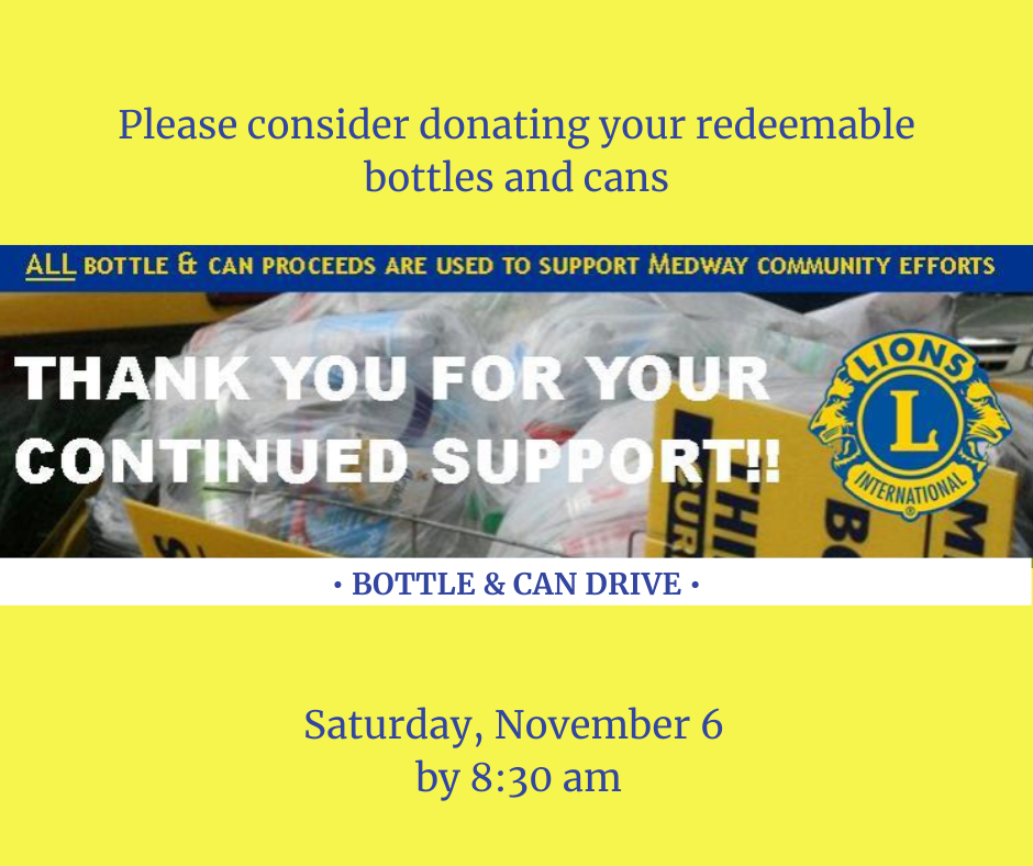 This Saturday is the Medway Lions Club bottle and can drive. All you have to do is bag up your bottles and cans and leave them at the end of your driveway by 8:30 a.m.this Saturday, November 6 and a volunteer will be by to pick it up. Please remember that you can also drop off donations at the West Medway Liquors shed anytime! Thank you.
