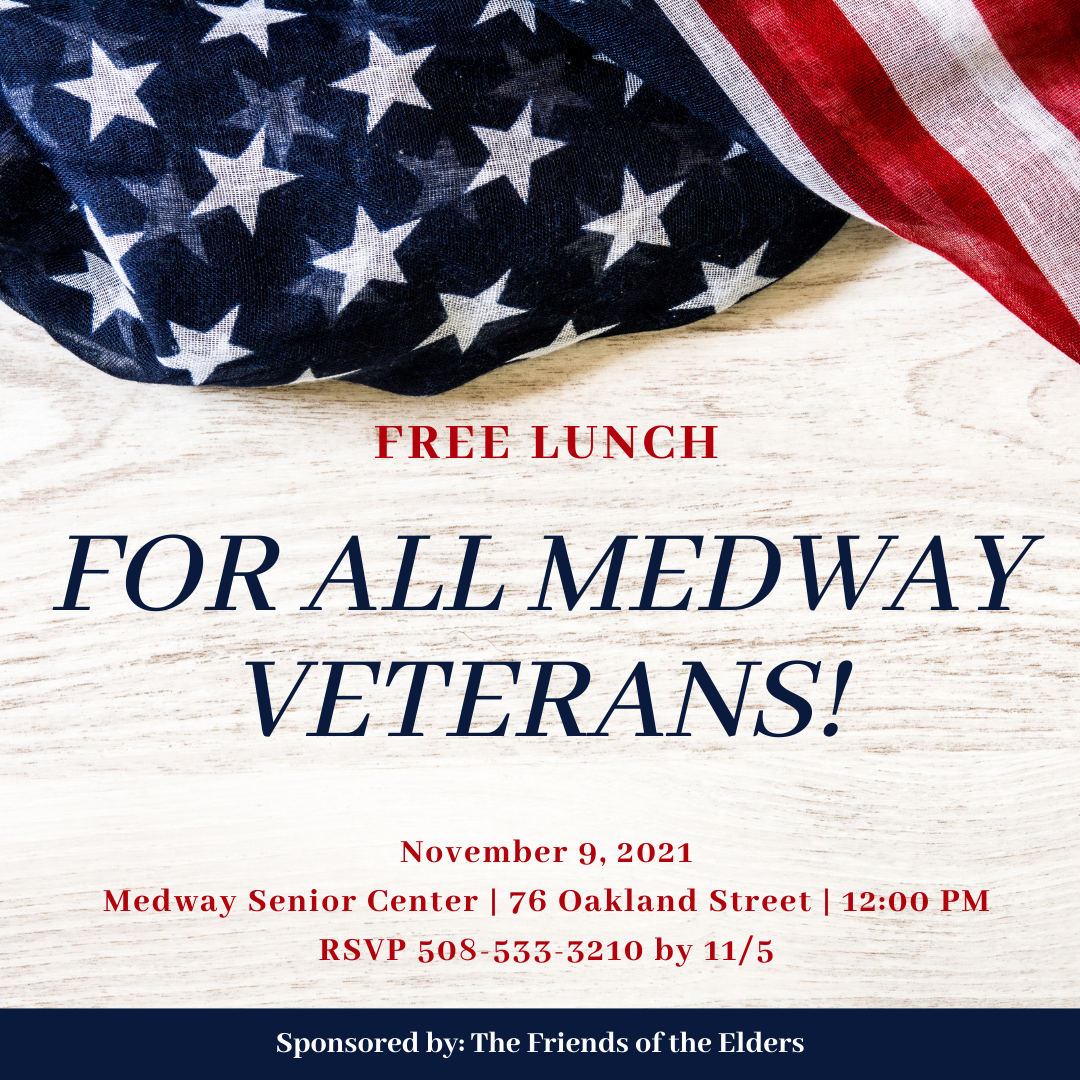 The Friends of the Elders is serving up a FREE lunch for ALL VETERANS at the Medway Senior Center on November 9. Please join us at the Oakland Cafe at noon for a delicious shrimp caesar wrap (or chicken), a bag of chips, bottled water, coffee or tea, and assorted desserts. Please call 508-533-3210 to RSVP by 11/5. The Senior Center is located at 76 Oakland Street. We hope to see you there!